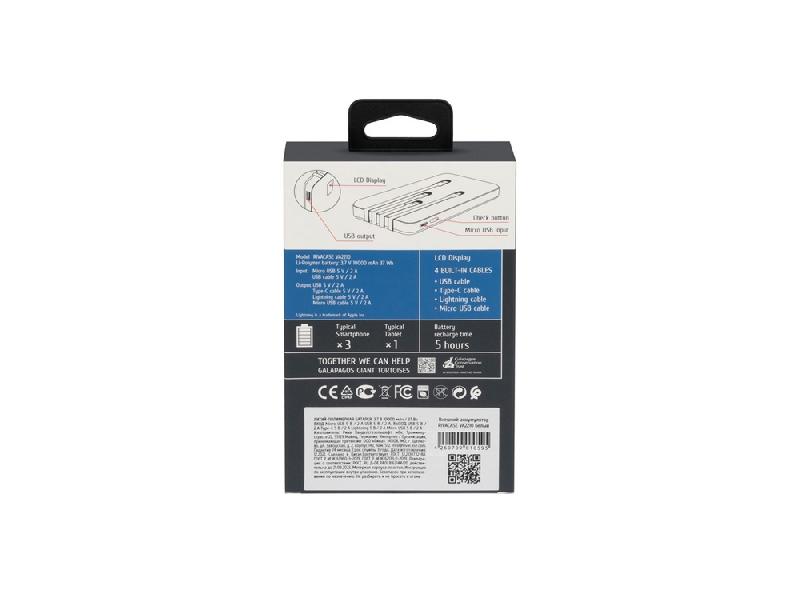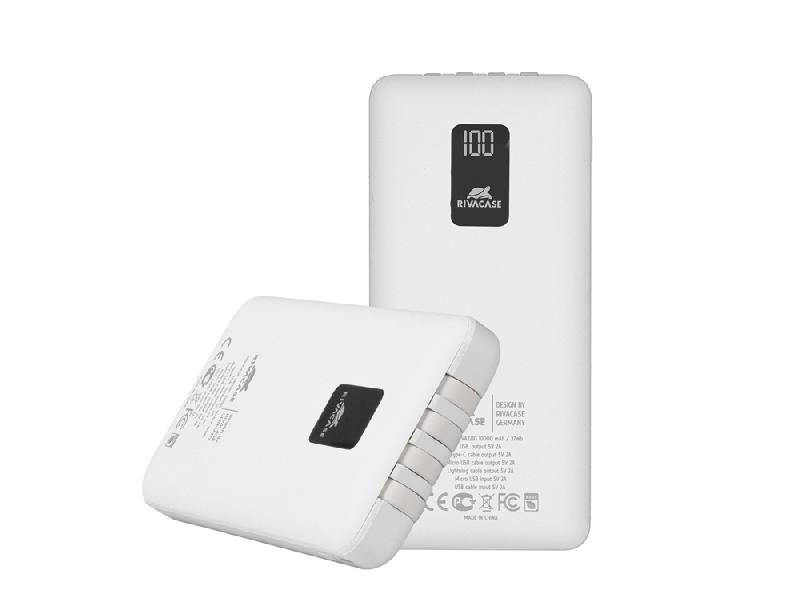 —RIVACASE VA2210 (10000 мАч) внешний аккумулятор с дисплеем и встроенными кабелями, белый, 12/48