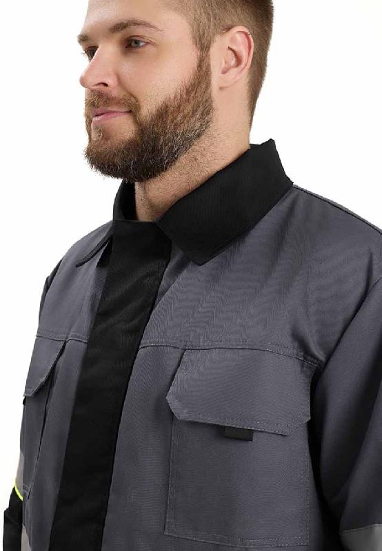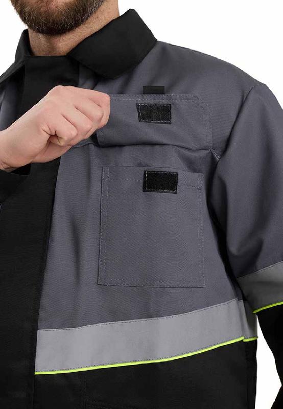Цвет основной-черный, отделочный-серый, отделочный-лимонный.Куртка прямого силуэта с центральной застежкой на Тракторную тесьму-молнию Т-5  (1-замковую) с планкой , фиксирующейся на контактную ленту «ВЕЛЬКРО». Отрезные кокетки спинки и полочек выполнены из отделочной ткани серого цвета.