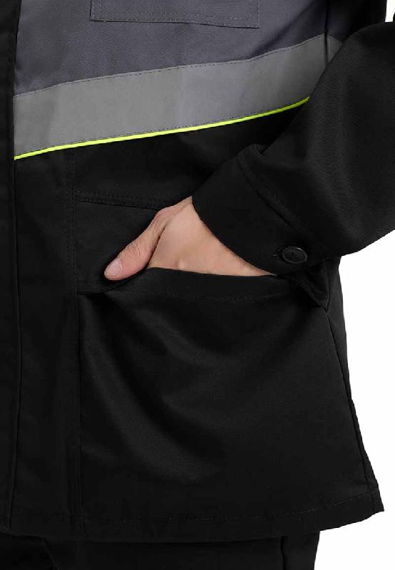 Полочка: нагрудные карманы с фигурными клапанами ,с застежкой на контактную ленту (4см). Для удобства имеются «флажки» из отделочной ткани черного цвета. Нижняя часть полочек  с накладными карманами, закрытыми клапанами. Одна сторона клапана входит в боковой шов, другая- в шов стачивания нижней части с центральной.     На левой полочке с изнанки настрочена лента Ф.И.О.                                                                                                                                                       Спинка: с отрезной кокеткой. Кулиса по талии  регулируется шнурком с фиксатором. Концы шнура входят в боковые швы, часть шнура с фиксатором выведена через обметанную петлю на кулиске. Рукава втачные. Верхняя часть рукава из отделочной ткани серого цвета, нижняя- черная.  Притачная манжета с застежкой на пуговицу.  Воротник отложной.  В шов горловины вставлена петля/вешалка с размерником и составником. СОП (шир.5см) настрочен на серые детали куртки-полочки, спинка, рукава.    В шов стачивания деталей: кокеток спинки , полочки, верхней части рукава с нижними частями вставлен кант  лимонного цвета.  Низ куртки обработан швом вподгибку с закрытым срезом шир.2,5см.