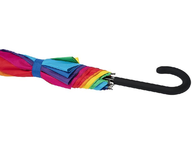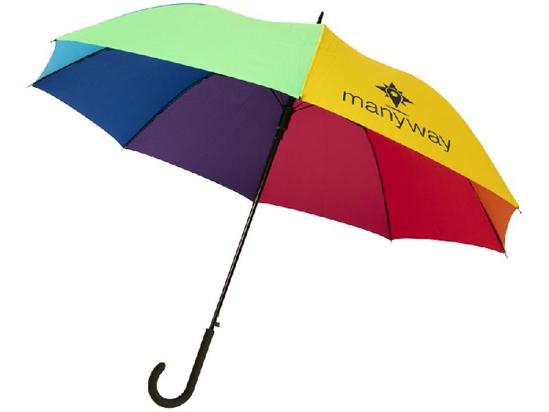 23-дюймовый ветрозащитный полуавтоматический зонт Sarah. Зонт с куполом из эпонж полиэстера, раскрашенный в цвета радуги. Прочный металлический стержень, высококачественная цельная рама из стекловолокна, обеспечивающая максимальную гибкость в ветреную погоду. Выгнутая ручка с мягким матовым покрытием, никелированные верхняя втулка и кончики спиц. Большая область для декорирования на каждой из панелей купола позволяет предложить различные креативные решения для логотипа. Эпонж полиэстер. Трафаретная печать (1 цвет (цветные изделия)) на данный товар осуществляется бесплатно. Оплачивается только настройка оборудования в размере 13700 рублей на весь тираж.